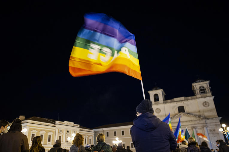 Un drapeau de la paix brandi à L’Aquila, en Italie, lors d’une manifestation contre la guerre en Ukraine, le 24 février 2022.